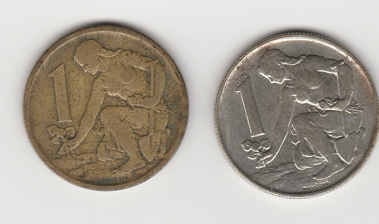 rád bych se zeptal na "Kačku", která je na obrázku. Všechny rozměry má stejné jako běžné mince tohoto vzoru, jen to vypadá, že se jedná o zkoušku na jiný kov (možná mědinikl?). Pro porovnání jsem přidal klasickou mosaznou 1Kčs, i když je z jiného roku, rozdíl je více než patrný.