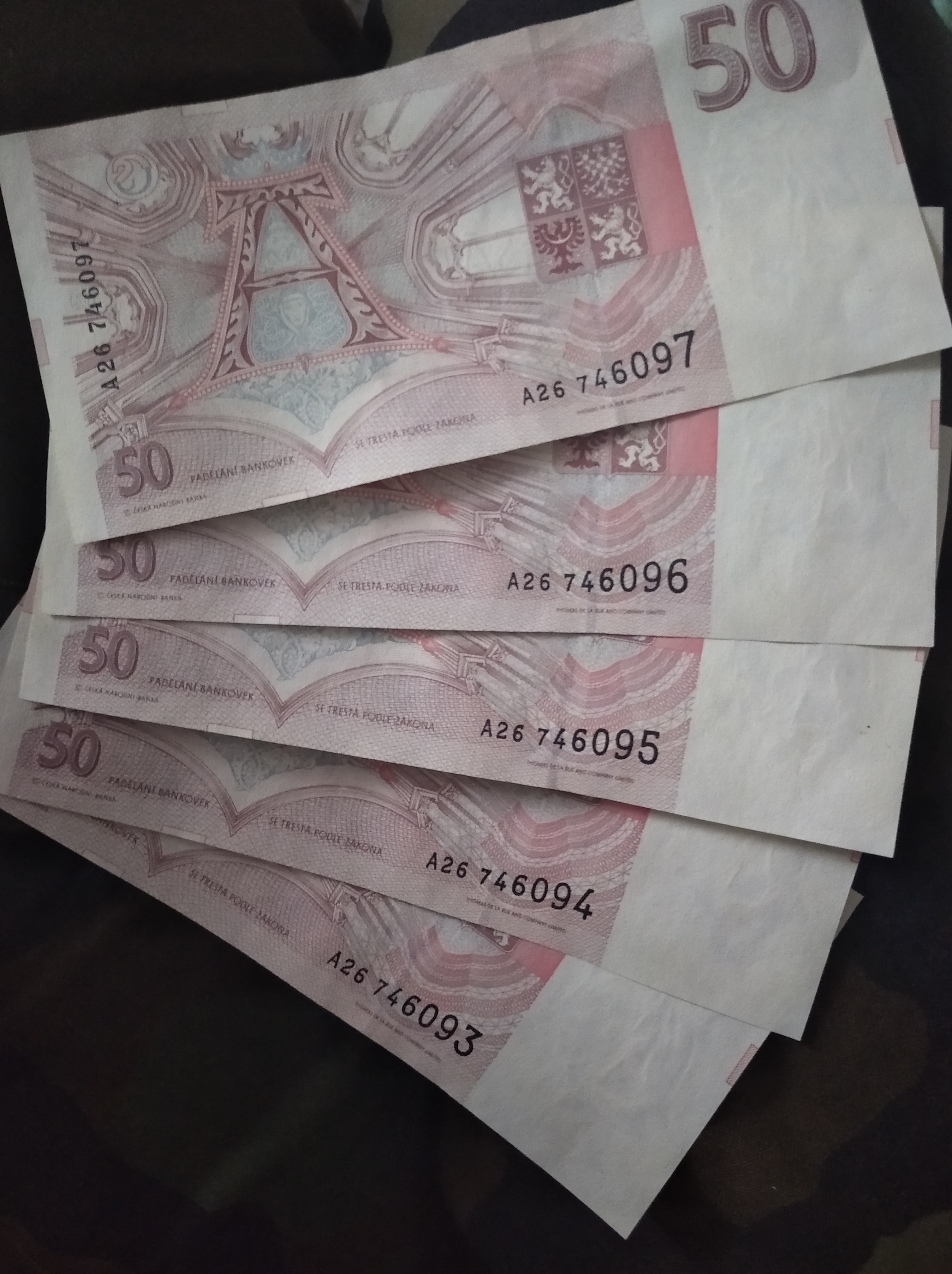 Zdravim lidi.prosim zajima me vas nazor,odhad ceny za techto 5 bankovek hodnoty 50Kč,stejna serie A,cislo jdouci po sobe,stav laicky receno..."jako ze stocku".jsem laik a kamos mi je nabizi jako uhradu dluhu(pouze 600,-),ma to smysl brat,vyplati se mi to?je trzni hodnota vyssi,nezli dluh ci nominalni(to asi jo)?tak diky za vase nazory.Honza