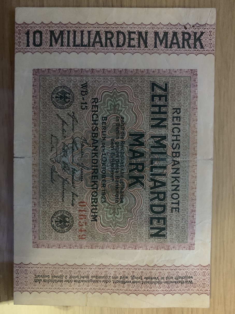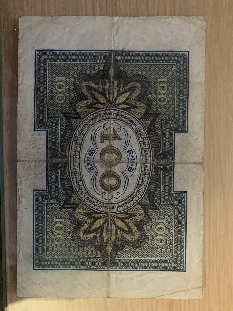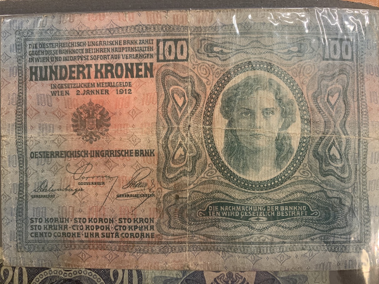 Německé i České bankovky v tomto stavu valnou cenu nemají. Třeba 10 miliardová Německá bankovka je bezcená, Ra.Uh. 50 K v tomto stavu asi 100 Kč, 1 Koruna pokud není přeložená a špinavá, tak kolem 400 Kč, 5000 Kč 1920, Specimen perforace nahoře, pokud není přeložená také asi 400 Kč.