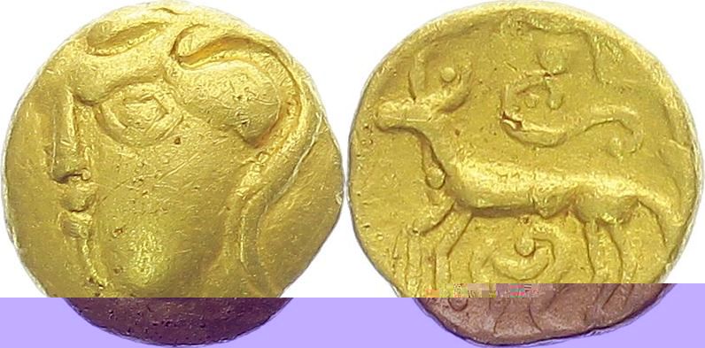 1/3 Statéru, ražba ze skupiny českých lokálních emisí, Hlava výrazně keltského stylu doleva s rozevlátými vlasy / Konkávní stylizovaný býk doleva, nahoře esovitě stočený had (?), dole nejasný "lyrovitý" motiv, Castelin 1965, 40-41, jako série I: 1-3, Taf. 4:59-61 (ale 1/3 Statéru neuvádí) (2,714 g)_RR!
